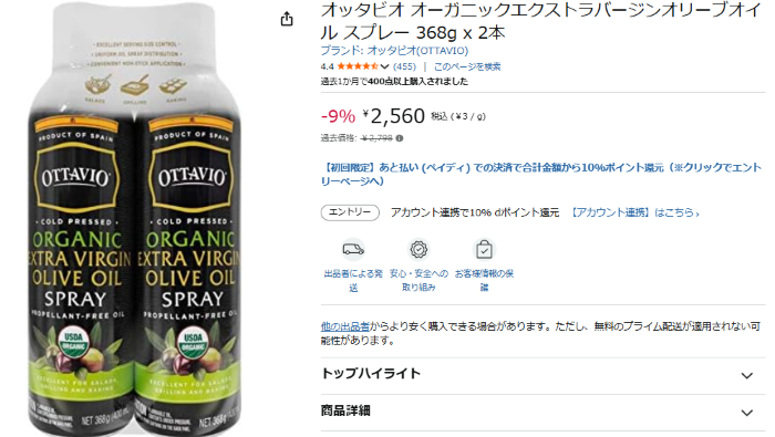 オイルスプレーは、スプレー器を購入したが即不具合発生が2回続いたので、今はスプレー機能が付いたオリーブオイルを利用しています。