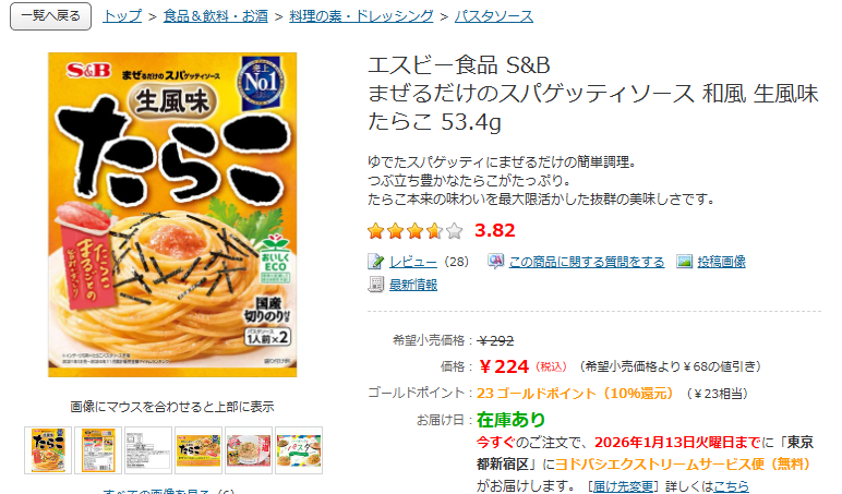 たらこパスタの素、今回はこちらの「まぜるだけのスパゲティソース 生風味たらこ」1人前と明太子2人前を利用しました!
