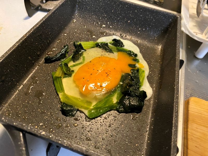 • フライパン(写真は玉子焼き機)に薄く油をしいて、冷凍ほうれん草で土手を作り、その中に生卵を割り入れる。